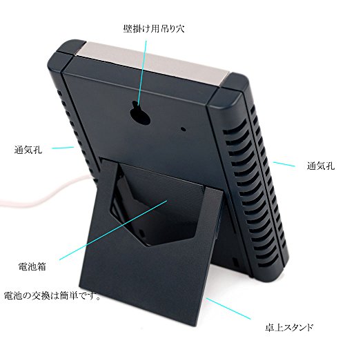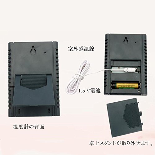 - 屋内/屋外温度表示、室内湿度、電源:1.5V(AAAサイズ)×1(含まれていません)、時間アラーム機能、毎日のアラーム機能を表示