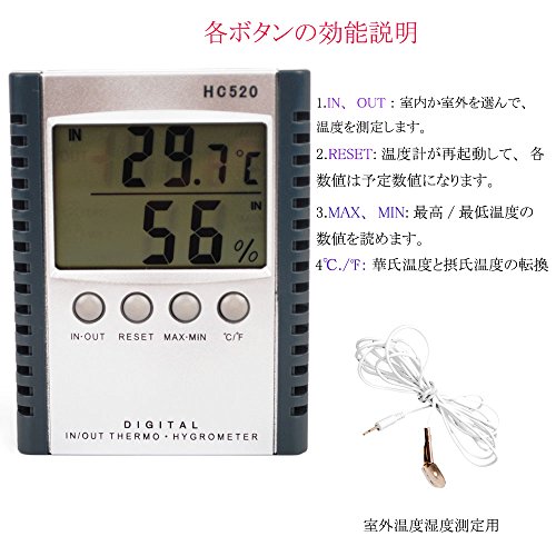 - 「IN-OUT」ボタンを押して、室内または室外を表示するように選択します。「MAX-MIN」ボタンを押すと、記録された最高/最低温度と湿度の値が表示します。「℃/°F」ボタンを押すと温度表示単位が転換します。「RESET」ボタンを押すと、温度計が再起動して、すべての設定値と記録値が最初の数値に変更されます。温度再測定します。