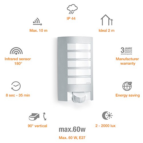 Compact modern wall light. Convenience, saftey, peace of mind and energy efficiencey in German quality.Feature high quality aluminium fascias, modern design and sensor technology that?s been tried and tested in millions of applications.Comes with a detection angle of 180o and max reach of 10m. The sensor tilting range(90o) and the ability to close offindiviadual segments permiy optimum adjustment of the detection range to the given situation. The tough polycarbonate diffuser evenly dispenses the light.