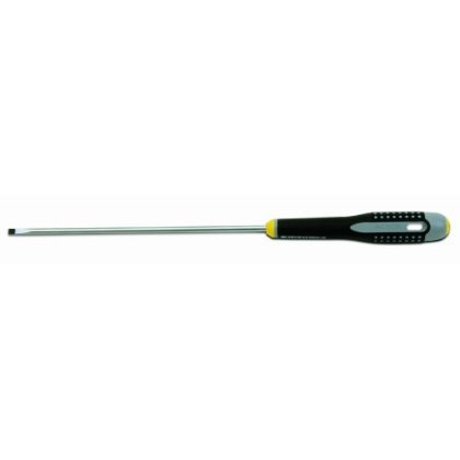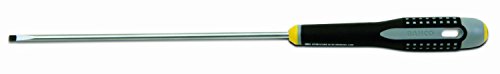 BAHCO 9 3/4 inch ergo slotted screwdriver with cabinet tip features the three component ergonomically designed handle provides comfort and maximum grip even with oily hands. The color coded handles indicate tip type and show tip type symbol on butt of handle for quick identification. The cabinet tip allows access to recessed screws. The black oxide tips prevent chipping of chrome to reduce possible contamination at work location. The tip width is 9/64 of an inch.
