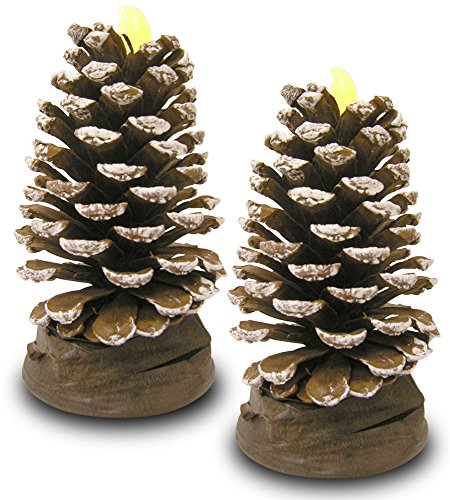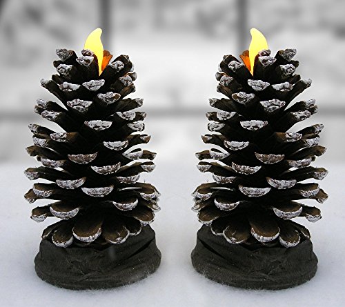 - LED REAL PINE CONE CANDLES. Beautiful brown pinecone with a dusting of snow on them. In this pack you will get 2 pcs. Each one is a flameless candle with a brown base. Perfect addition to your winter decorations this year. Buy more than 1 set to put in your windows and light up the neighborhood.