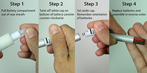 4個セットLEDワックステーパCandlesで6時間タイマー。指示をオン/オフにします。炎を – 押し込み指まで炎をオンに – 押し込みをもう一度オフ]をクリック – 上のままにした場合、グローの6時間バッテリー交換手順に自動消灯します。 – プルフレームアウト表示するワックスシースのメタルバッテリーCanister。 – オフホワイトのツイストキャップ容器底面のcounter-clickwiseバッテリー – 交換電池を逆の順序で表示されます。