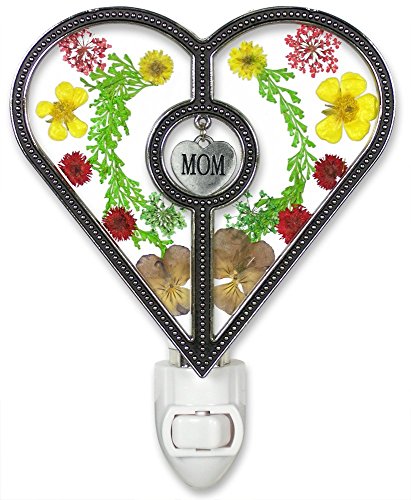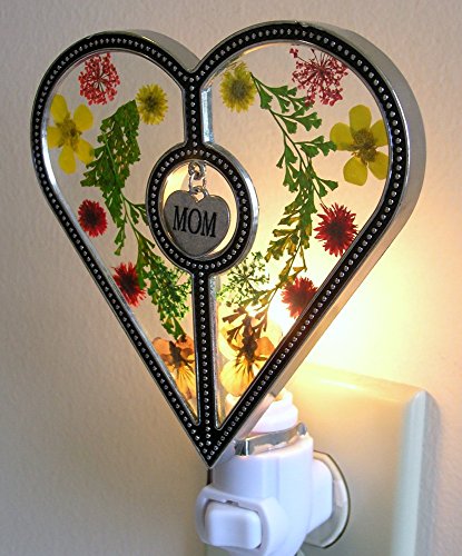 - HEART SHAPED NIGHT LIGHT. Glass Heart with pressed flowers. Wall nighlight with engraved MOM heart charm. Embedded colorful real dried flowers in glass. ONE OF A KIND GIFT FOR MOM.
