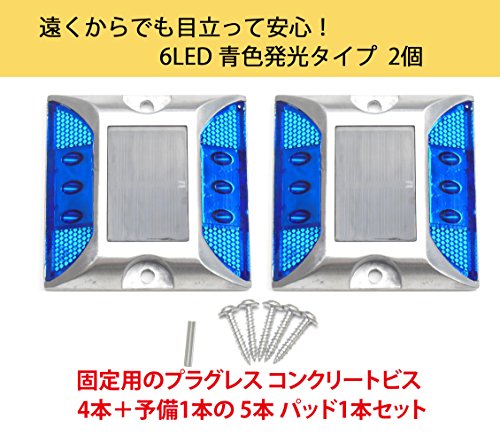 - お得な 2個 セット ! 3 LED × 2 列 の 6 LED ソーラー充電式 自動点滅 防水 道路鋲 路肩標 誘導灯 ( 青色 発光 ) 2個 と 固定用 コンクリートビス ノープラグ 座付 4×25mm 5本 ( パッド 1本付 )の セット商品 です