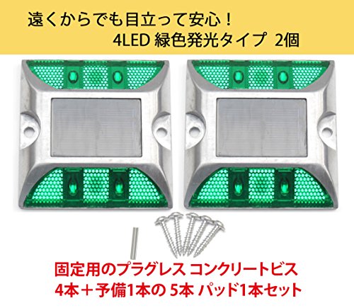 - お得な2個セット ! 2LED × 2 の 4LED ソーラー 充電式 自動点滅 防水 道路鋲 路肩標 誘導灯 ( 緑 色 発光 ) 2個 と 固定用 ノープラグ 座付 コンクリートビス 4×25mm 5本 ( パッド 1本付 )の セット商品 です。