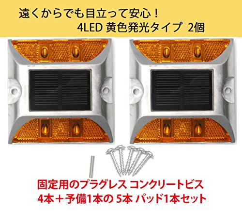 - お得な 2個 セット 4 LED タイプ の ソーラー 充電 式 自動点滅 防水 道路鋲 路肩標 誘導灯 ( 黄 色 発光 )と 固定用 コンクリートビス ノープラグ 座付 4×25mm 5本 ( パッド 1本付 )の セット商品 です。