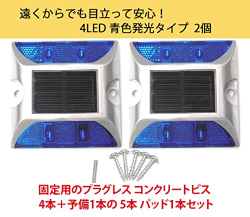 - お得な 2個 セット ! 2LED × 2列 の 4LED ソーラー充電式 自動点滅 防水 道路鋲 路肩標 誘導灯 ( 青 色 発光 )と 固定用 コンクリートビス ノープラグ 座付 4×25mm 5本 ( パッド 1本付 )の セット商品 です。