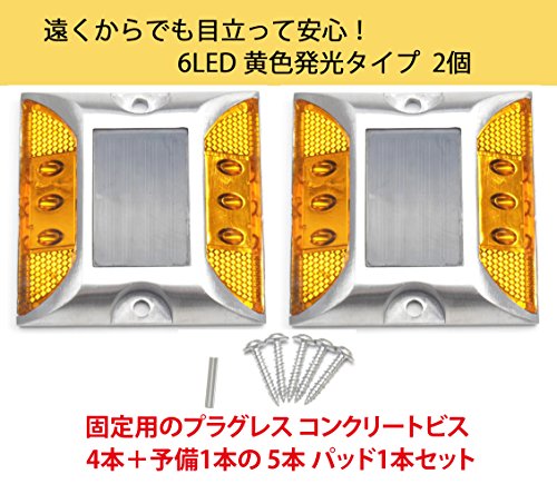 - お得な 2個 セット ! 3 LED × 2 列 の 6 LED ソーラー充電式 自動点滅 防水 道路鋲 路肩標 誘導灯 ( 黄色 発光 ) 2個 と 固定用 コンクリートビス ノープラグ 座付 4×25mm 5本 ( パッド 1本付 )の セット商品 です。