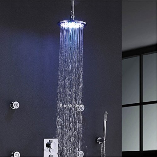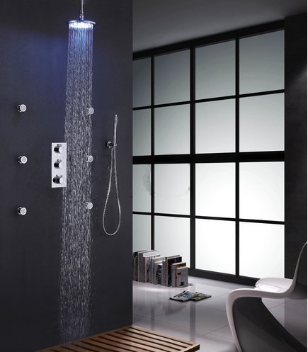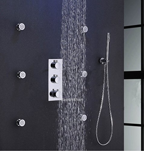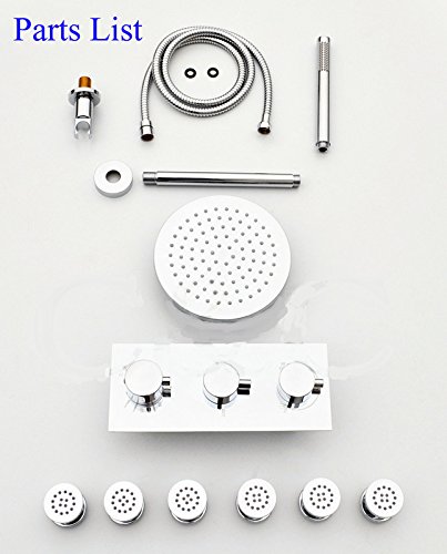 8 Inch Chrome LED Shower Head 6 Pcs Spa Body Massage Spray Jets Thermostatic Bathroom Round Shower Set