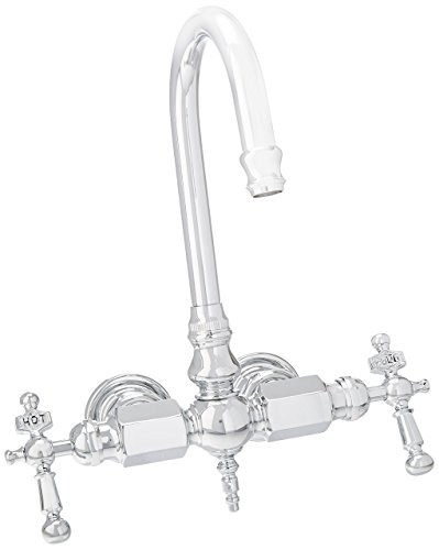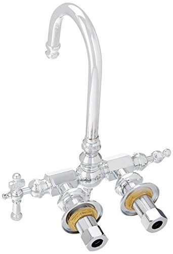 A different look is achieved with this uniquely shaped faucet body and intricately designed lever handles. 3.325-Inch centers. Compression stems 1/4 turn. Gooseneck spout.