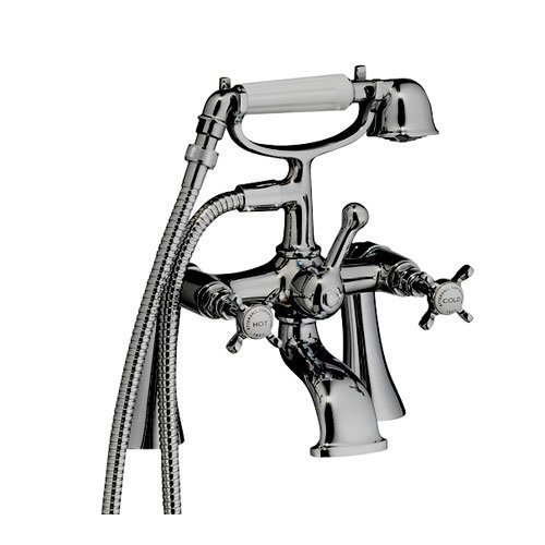 Finish: Polished Chrome Tub Rim Mounted Hand Held Shower Elephant spout hand shower. 7-Feet centers 5-Feet e-Pounded mounts included Spout length is 4-Feet To be used with straight bath supplies (Part #5577). Handles: Metal Cross.