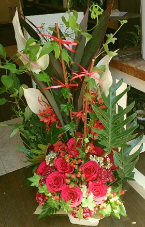 赤バラを使って高さをだしてゴージャスーなフラワーアレンジメントです。
