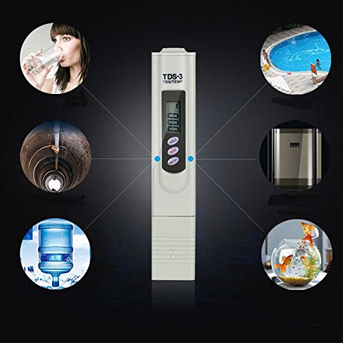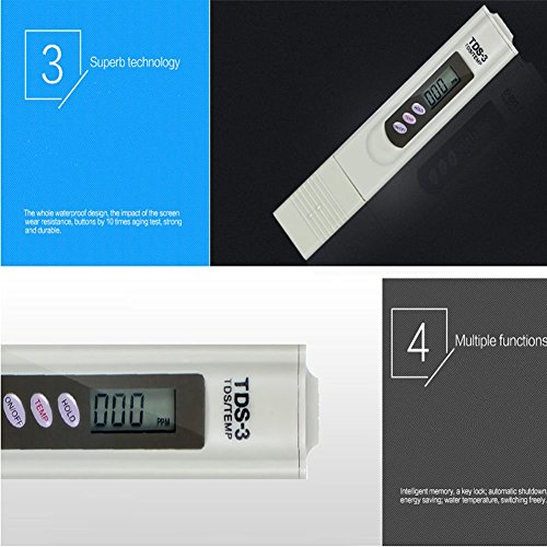 プロ品質の計器クラスタのTDS、TDSと温度のテスター機器 ?TDSメーターは、あなたのポケットの水のテスターのプロのレベルに適しています! すべての水質検査、浄水用途、排水規制、水耕栽培、水耕、実験室などの科学的テスト、プールスパ、エコロジーテスト、銀コロイド、水処理などに最適。 特徴: ロック機能は - 簡単に読み取ることができ、レコード、HOLDキーを押したボタンは、その後、試験溶液から除去されます。 5分自動シャットダウンするので、電池が切れていません。 測定範囲:0-9990ppm 精度:±2%