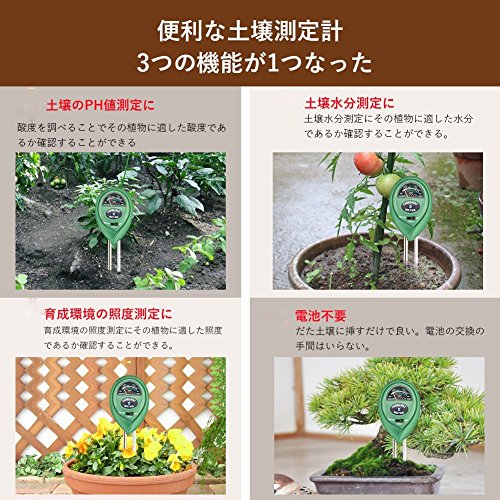 - 【3in1の機能付き】:園芸や農作物の生育管理に最適な土壌酸度計です。スライドスイッチの切り替えて土壌の湿度、照度、PH値の測定が可能です。