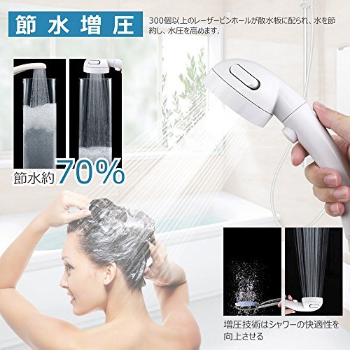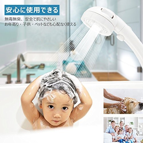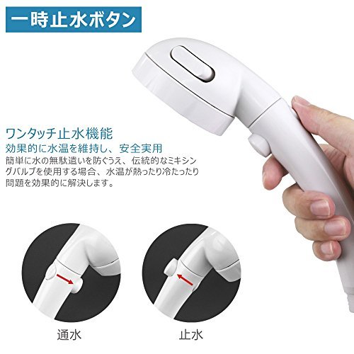 - 【一時STOPボタン&簡単取り付け】一時的にワンタッチで水をON/OFFできる。シャワー中、わざわざ給水栓を閉める必要がない、目を閉じたまま操作でき、お湯を無駄にしない;当製品接続のネジは国際汎用基準G1/2で、ほとんどのホースとマッチングするができます。女性でも簡単取り付け、交換できますので、ご安心に購入してください。 ご注意:少数のシャワー用品ブランドは自分のネジ基準があるから、この場合はアダプター(別売り)が必要です。予めご了承ください。
