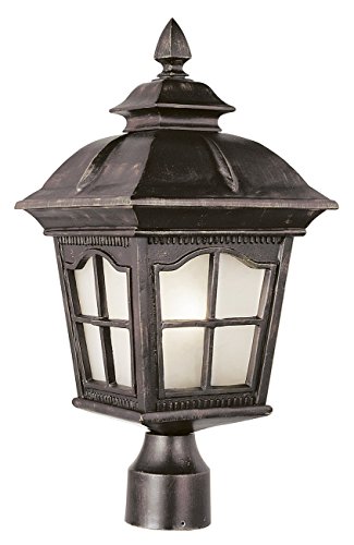 Antique rust finish. Single light outdoor energy efficient medium post light featuring frosted glass. Energy Efficient from the New American outdoor collection of Trans Globe. A Colonial favorite with scalloped window frames and watered glass. Requires 1 24-Watt GU24 Bulb.
