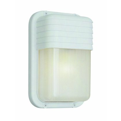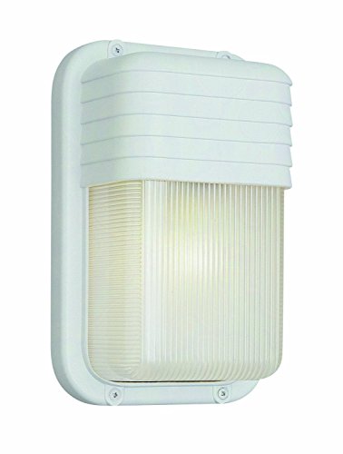 Browed ribbed rectangle bulkhead. 41105 SAL Finish: Satin Aluminum Features: -One light bulkhead.-Polycarbonate glass.-UL listed for wet location.-ADA compliant. Construction: -Cast aluminum construction. Color/Finish: -Black finish.-White finish.-Satin aluminum finish.-Verde green finish. Specifications: -Accommodates (1) 60W medium base bulbs (not included). Dimensions: -Overall dimensions: 10'' H x 6.5'' W x 4'' D.