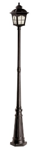 Energy Efficient from the New American outdoor collection of Trans Globe, A Colonial favorite with scalloped window frames and watered glass, Requires 1 24-Watt GU24 Bulb, Black finish, Includes both post and light