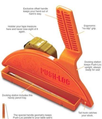 Rubber sole helps prevent slippage and won't mar your work piece.. A push stick isn't doing much good if you can't find it! Push-Loc comes with an exclusive docking station that mounts to your tool so Push-Loc is always upright and ready for use. The docking station is also a handy pencil tray, and it even holsters two tape measures. Push-Loc's innovative handle is offset to the left for better safety and visibility. It gets your hands out of harms way, allows you to see your workpiece better, and you won't bang your knuckles on the blade guard. The offset also allows you to use it horizontally on the router table.Made in USA.Offset handle keeps your hand out of harm's way and improves visibility.Ergonomic "no-slip" grip.Rubber sole helps prevent slippage and won't mar your workpiece.Exclusive docking station keeps Push-Loc upright, always ready for use.