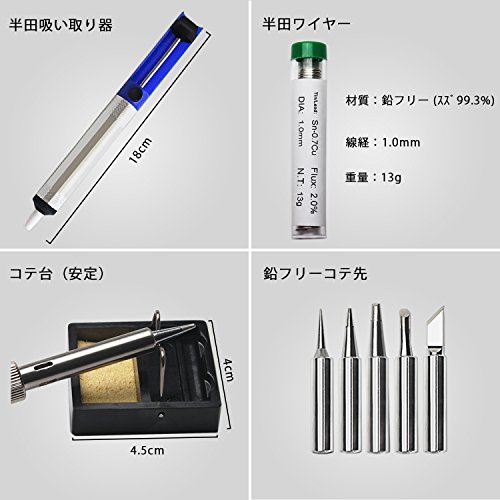 - 【セット内容】1 x半田ごて、1 x鉛フリー半田ワイヤー、1 xはんだ吸い取り器、1 xコテ台、5x鉛フリー交換コテ先、最も重要な付属品が付いていて、 初心者も使用できます。