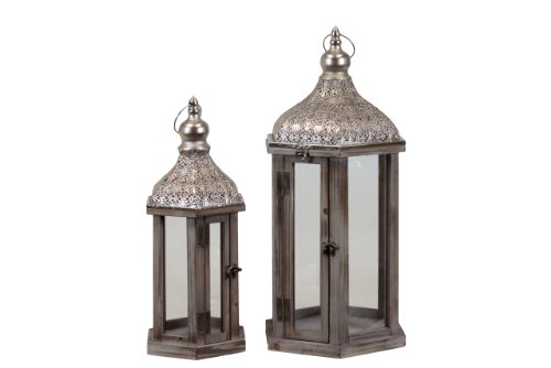 - Benzara Wooden Lantern with Beautifully Elaborated Metallic Roof, Set of 2
