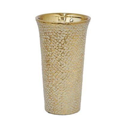 This beautiful Tumbler shape ceramic Vase is a perfect combination of beauty and style. This unique Vase is crafted from porcelain-ceramic and dyed in Golden hues. Highlighting feature about this Vase is it has fish scales design all over it. The mouth of this Vase is wide hence it can hold lot many flowers and turn out to be beautiful flower Vase. This Vase is unique that it will complement range of home interiors. Adorn it in your bedroom kitchen drawing room or study. Place it on side table center table dinner table mantel or wall racks. This Vase you can add to your collection and create beautiful display. This Vase can be gifted to near and dear ones who love ceramic vases. This Vase is light weight and easy to clean as well. If you wish this Vase to be included in your home interior you need to get it without Ado.