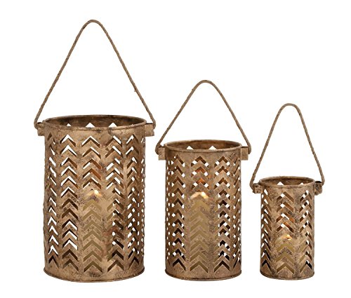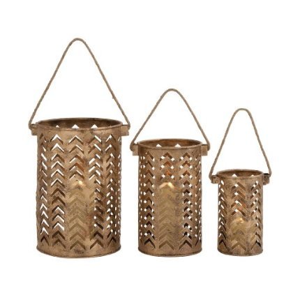 Features This Set of Three Metal Lantern Candle Holders measures 18 inch (W) x 16 inch (D) x 13 inch (H) Made of metal Antique appeal with rusty gold shade Description: Deck up your modern home with this lovely set of 3 candle holders. Crafted from metal, this cylindrical set of 3 holders comes in three different sizes with rimmed round edges and a triangular shaped handle for ease in mobility. These rusty gold dyed candle holder set features intricate cravings and design all over so as to let the light of the candle pass. You can place this set together or separately, either way these holders are set to give your home a warm aura of the yesteryears. Your guests and visitors will be in awe at the sight of this unique set and praise your high choice in home decor. This set of 3 candle holder is very easy to maintain and clean. It is designed to suit all types of ambience and surroundings. It will also make up for an excellent choice to present to your family and friends and they surely will treasure this lovely present. So wait no more and get one now.