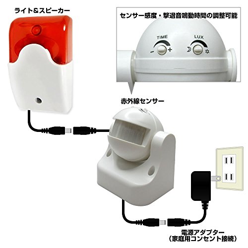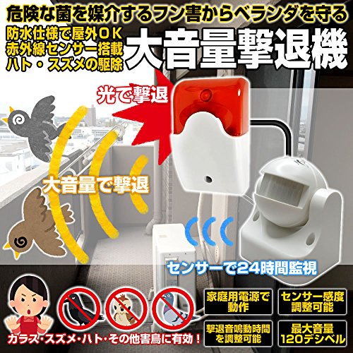 動物センサーで動物(人間)を感知して大音量で撃退音を発生します。 防犯用途、ベランダ等のハトよけ、庭などの動物侵入対策に使用できます