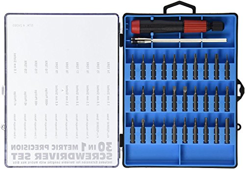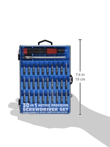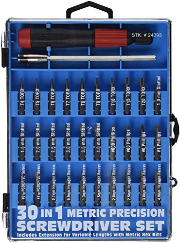 30 in 1 Metric Precision Screwdriver Set: Screwdriver Set includes handle, extension and 30 Bits in Torx, Phillips, Slotted, Pozidrive, and Hexagon. (9) Torx Bits: T4, T5, T6, T7, T8, T9, T10, T15, T20 (7) Slotted Bits: 1.0mm, 1.5mm, 2.0mm, 2.5mm, 3.0mm, 3.5mm, 4.0mm (4) Phillips Bits: 000, 00, 0, 1 (2) Pozidrive Bits: 0, 1 (8) Hexagon Recess Bits: 0.7mm, 0.9mm, 1.3mm, 1.5mm, 2.0mm, 2.5mm, 3.0mm, 4.0mm