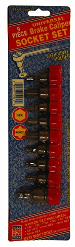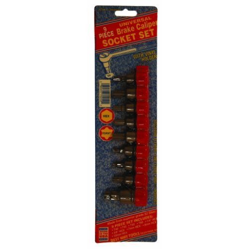 BWT 70250: 9pc Universal Brake Caliper Socket Set: 3/8' drive socket base. Bit tip size Torx T40, T45, T50, T60, fractional hex 1/4', 3/8', metric hex 7mm, 8mm, and 10mm. Bits are machined in the USA from high strength S2 tool steel. Set comes with a vinyl holder to keep tools organized. The bit sockets can be used with T-handle, ratchet, square screwdriver. Each socket is individually marked for easy reference.