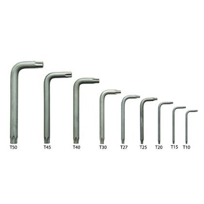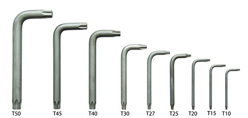 9 piece Bent 'L' TORX Key: Precision machined tips for exact fit. Hardened for extreme durability to reduce screw head cam-out. Sizes, T-10, T-15, T-20, T-25, T-27, T-30, T-40 T-45, T50.