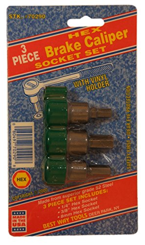 BWT 70290: 3pc Hex Recess Brake Caliper Socket Set: 3/8' drive socket base. Hex recess bit tip sizes 1/4', 3/8', and 8mm. Bits are machined in the USA from high strength S2 tool steel. Set comes with a vinyl holder to keep tools organized. The bit can be used along with a 1/4' driver or in application with the bit socket holder. 1/4' bit socket holder can be used with T-handle, ratchet, square screwdriver. Each socket and bit is individually marked for easy reference.