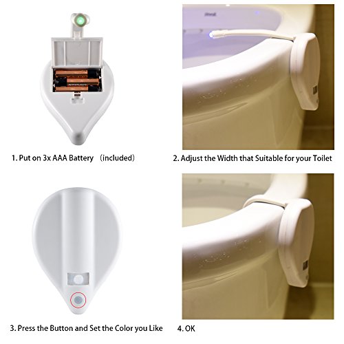 - 3 AAA電池(含まれています)、メモリ機能付きで省エネスプラッシュプルーフ:トイレ便器のライトがオンになっていることを確認して、後日の – の電源を切ります。スプラッシュプルーフ、ショートさせませんように、また、デバイスとは、が浸水した。衛生的なデザインを使用すると、簡単にクリーニング