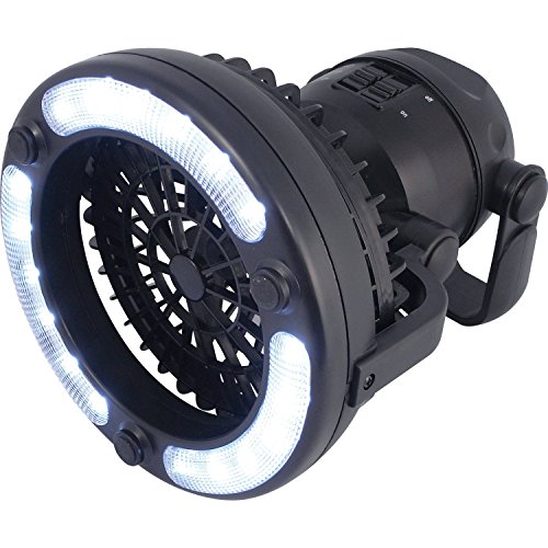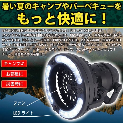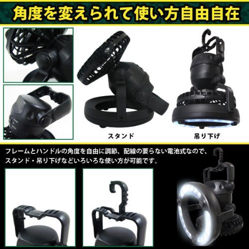 - 持ち運びが簡単なコンパクトサイズ。ライトはLEDが18個もついて明るさ十分。ライトと扇風機は角度が自由に調節可能。そのまま置くことも、吊