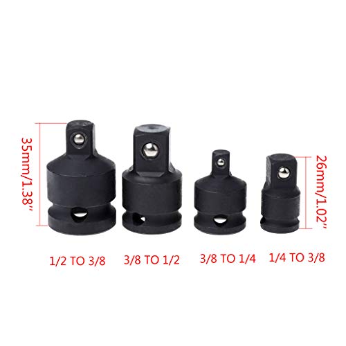 - ✈1:3/8 "から1/4" - (9.5mm四角穴から6.3mm四角頭まで)長さ:26mm / 1.02 "。2:1/4 "から3/8" - (6.3mm角の穴から9.5mm角のヘッドまで)長さ:25mm / 0.98 "。3:3/8 "から1/2" - (9.5mm角の穴から12.5mm角の頭まで)長さ:35mm / 1.38 "。4:1/2 "から3/8" - (12.5mm角の穴から9.5mm角の頭まで)長さ:36mm / 1.42 "