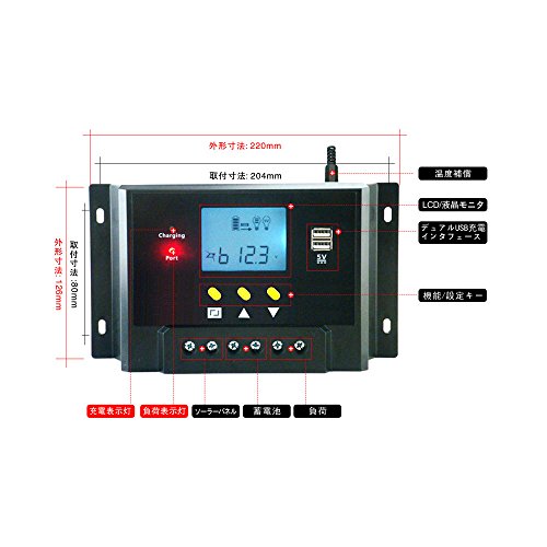 商品仕様: カラー:ブラック サイズ: 22 x 12.6 x 4.6 cm パッケージ重量:1000g PVのシステム電圧:48V 交換電池:鉛蓄電池 充電方法:3-state- PWMチャージ USB充電ポート:5V 1A