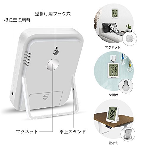 - 【温湿度記憶】最高、最低温湿度が自動的に記憶でき、時計表示(24h/12h)を切り替えることができます。また、ボタン一つで摂氏/華氏温度表示に切り替えるので、お好きな表現形に設定できます。