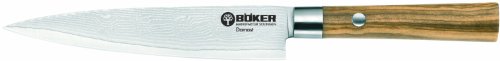 Kitchen knife by Boker. The story of success continues. The famous and very popular Damascus kitchen knives are now available with Mediterranean olive wood, which is hand selected to guarantee that only the best pieces of wood can be attached to these Damascus blades. The warm tone and lively feel of the wood makes food preparation all the more enjoyable. Outstanding edge retention and style at the same time! Blade length: 5 3/4". Overall length: 10 3/4". Weight: 1.9 oz.