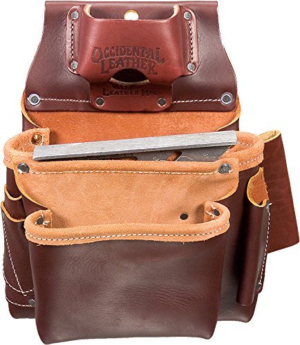 Tools not included. The two pouch profastener leather bag is designed to hold tools commonly accessed with the left hand, and is worn on the left side of the body. Part of the ProLeather series of tool bags made from premium grain cow hide, and tanned with special waxes and oils to withstand considerable outdoor use. Also includes a leather sleeve for a tri-square. Proudly made in the USA.