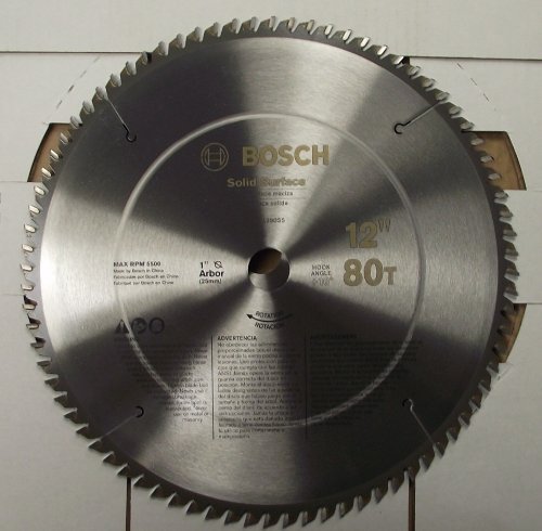 Bosch 12 x 80T Carbide HLTCG Saw Blade PRO1280SSB Solid Surface Professional Series 1" Arbor +10degree hook angle Laser cut tensioned and fully hardened plate Solid surface grind tooth configuration .103 plate thickness 5500 max. rpm. .145 kerf thickness Patented oversized c4 dyanite carbide teeth for smooth clean cuts