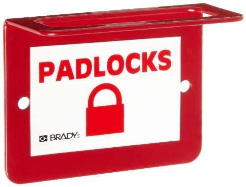 Brady LR060E/45649 small padlock station measures 2 1/4" height, 3"width, 1-1/4" depth. Padlocks are sold separately. Size is 2-1/4" height, 3" width, 1-1/4 depth. Color is white on red, , material is 14 gauge steel with red plastic coating.