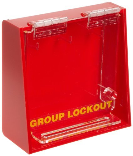Brady LG003E acrylic wall lock box-small acrylic wall-mounted lock box accommodates up to 6 padlocks. The small lock box has 3 key hooks and holds up to 6 padlocks. Locks are sold separately. Size is 6" height, 6" width, 2-1/2" depth. Legend is "GROUP LOCKOUT", color is red, , material is acrylic clear plastic.
