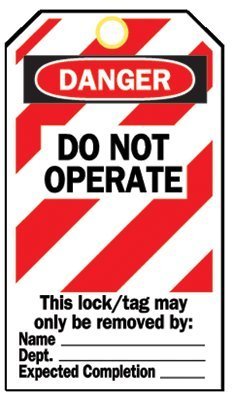 Not recommended for outdoor use and chemical exposure. B-853 Cardstock Lockout Tags 65452 size is 5-3/4" Height, 3" Width in black and red on white color. Header is "DANGER", front legend is "DO NOT OPERATE This lock/tag may only be removed by: ETC (w/ diagonal stripes)" and back legend is "This energy source has been LOCKED OUT! Only the individual who signed the reverse side may remove this lock/tag. Remarks:". Substrate type is paper cardstock. Standard material colors are white, yellow, red, green, fluorescent orange, fluorescent red, fluorescent green, chartreuse and orange. Standard legend colors are black, red, green, magenta, orange, yellow, and blue. Shelf Life is Indefinite when stored at 70 degree fahrenheit (21 degree celsius) and 40 percent to 50 percent R.H.