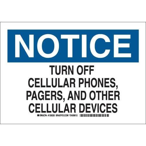 Brady radiation signs can help you comply with OSHA's regulations for radiation safety and laser warnings. These radiation signs offer messages for radiation danger, microwave warning signs and other radioactive warning safety signs. Radiation signs can be placed around your facility where radiation and x-ray safety are concerns. HEADER: NOTICE. Legend: Turn Off Cellular Phones, Pagers And Other Wireless Devices.
