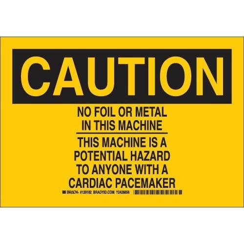 Brady radiation signs can help you comply with OSHA's regulations for radiation safety and laser warnings. These radiation signs offer messages for radiation danger, microwave warning signs and other radioactive warning safety signs. Radiation signs can be placed around your facility where radiation and x-ray safety are concerns. Header: CAUTION. Legend: No Foil Or Metal In This Machine This Machine Is A Potential Hazard To Anyone With A Cardiac Pacemaker.