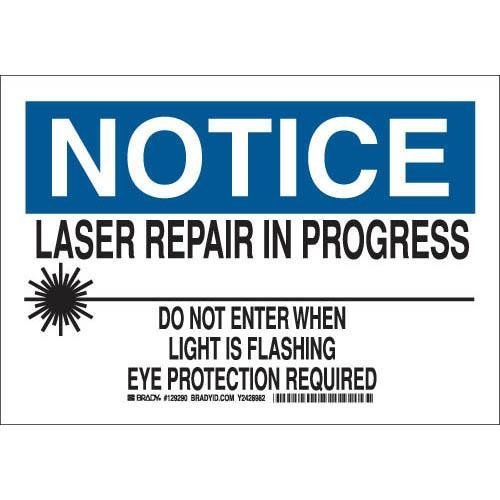 Brady radiation signs can help you comply with OSHA's regulations for radiation safety and laser warnings. These radiation signs offer messages for radiation danger, microwave warning signs and other radioactive warning safety signs. Radiation signs can be placed around your facility where radiation and x-ray safety are concerns. Header: NOTICE. Legend: Laser Repair In Progress Do Not Enter When Light Is Flashing Eye Protection Required.