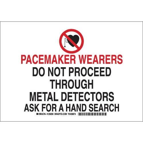 Brady radiation signs can help you comply with OSHA's regulations for radiation safety and laser warnings. These radiation signs offer messages for radiation danger, microwave warning signs and other radioactive warning safety signs. Radiation signs can be placed around your facility where radiation and x-ray safety are concerns. Header: (no header). Legend: Pacemaker Wearers Do Not Proceed Through Metal Detectors Ask For A Hand Serarch.