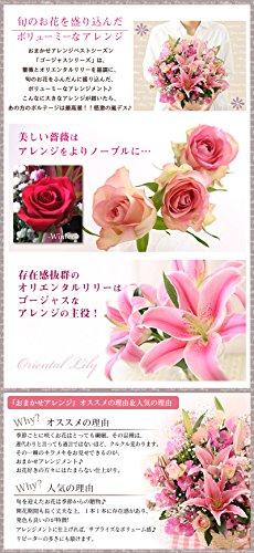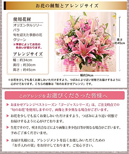 おまかせアレンジベストシーズ「ゴージャスシリーズ」は、薔薇とオリエンタルリリーを基調に、旬のお花をふんだんに盛り込んだボリューミーなアレンジメント♪ こんな大きなアレンジが届いたら、あの方のボルテージは最高潮!!感激の嵐です♪