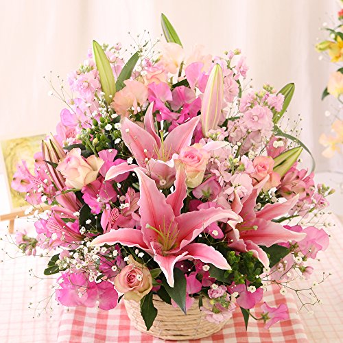- オリエンタルリリー・バラ・季節の花&季節のグリーンたち、ラッピング付、バスケット入