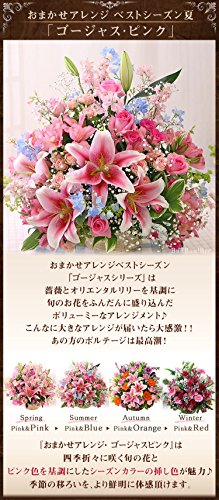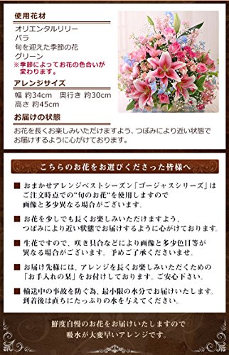 おまかせアレンジベストシーズ「ゴージャスシリーズ」は、薔薇とオリエンタルリリーを基調に、旬のお花をふんだんに盛り込んだボリューミーなアレンジメント♪ こんな大きなアレンジが届いたら、あの方のボルテージは最高潮!!感激の嵐です♪